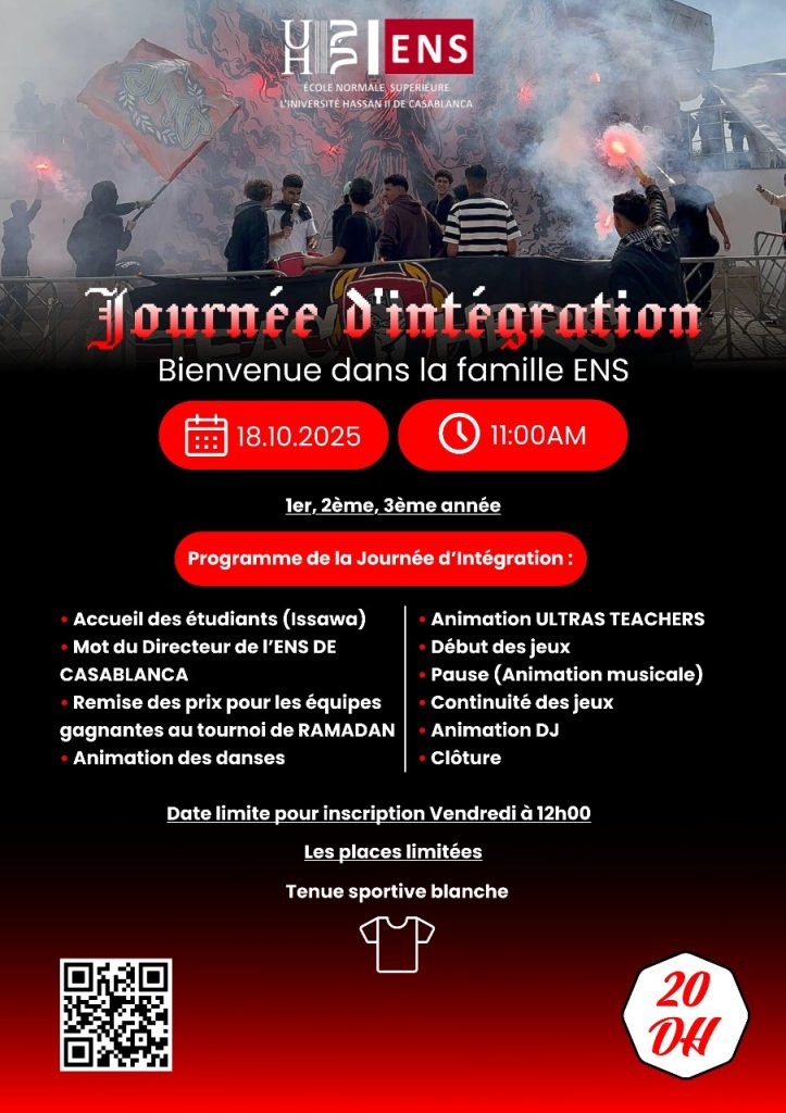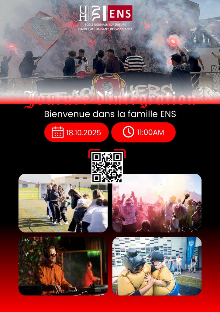 L’École Normale Supérieure de Casablanca est heureuse d’annoncer la tenue de sa Journée d’Intégration, le samedi 18 octobre 2025 à partir de 10h00.